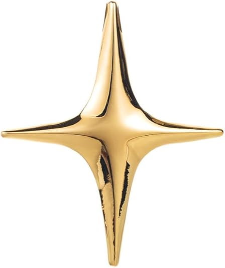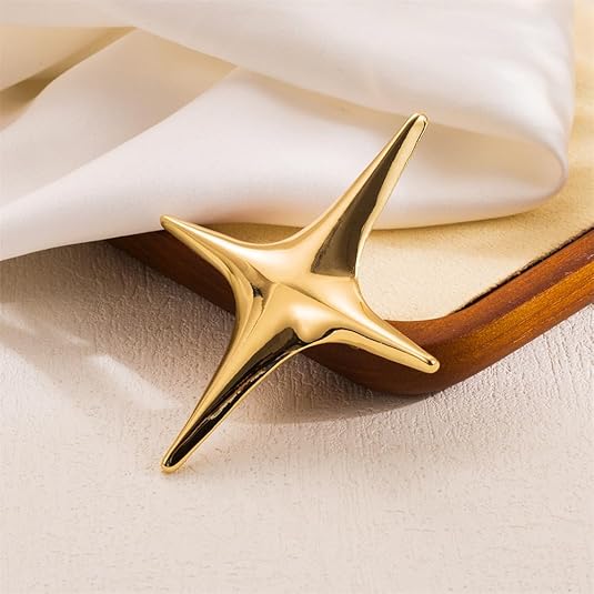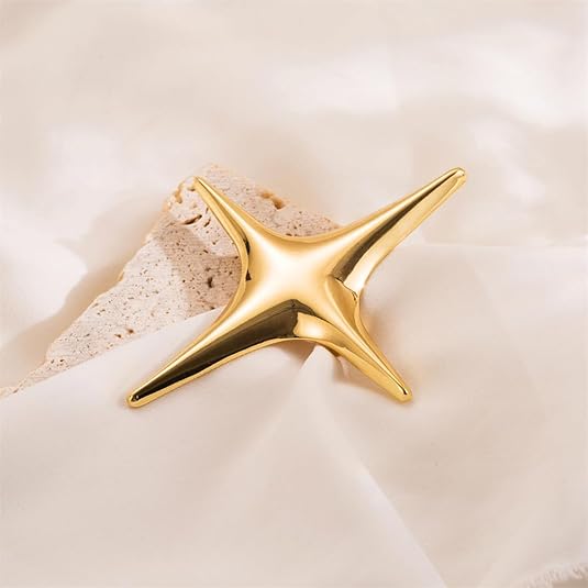 This striking gold star brooch features a bold and minimalist design that radiates a futuristic aesthetic. Crafted in a stretched four-point star shape, it symbolizes brilliance, power, and individuality. Whether worn on a jacket, dress, or bag, it draws attention with its sculptural elegance and polished metallic shine.