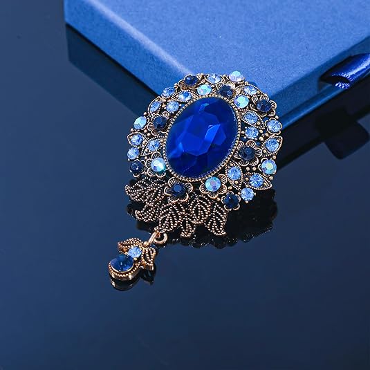 Vintage Sapphire Brooch – Royal Blue Crystal Pin with Dangling Pendant for Women